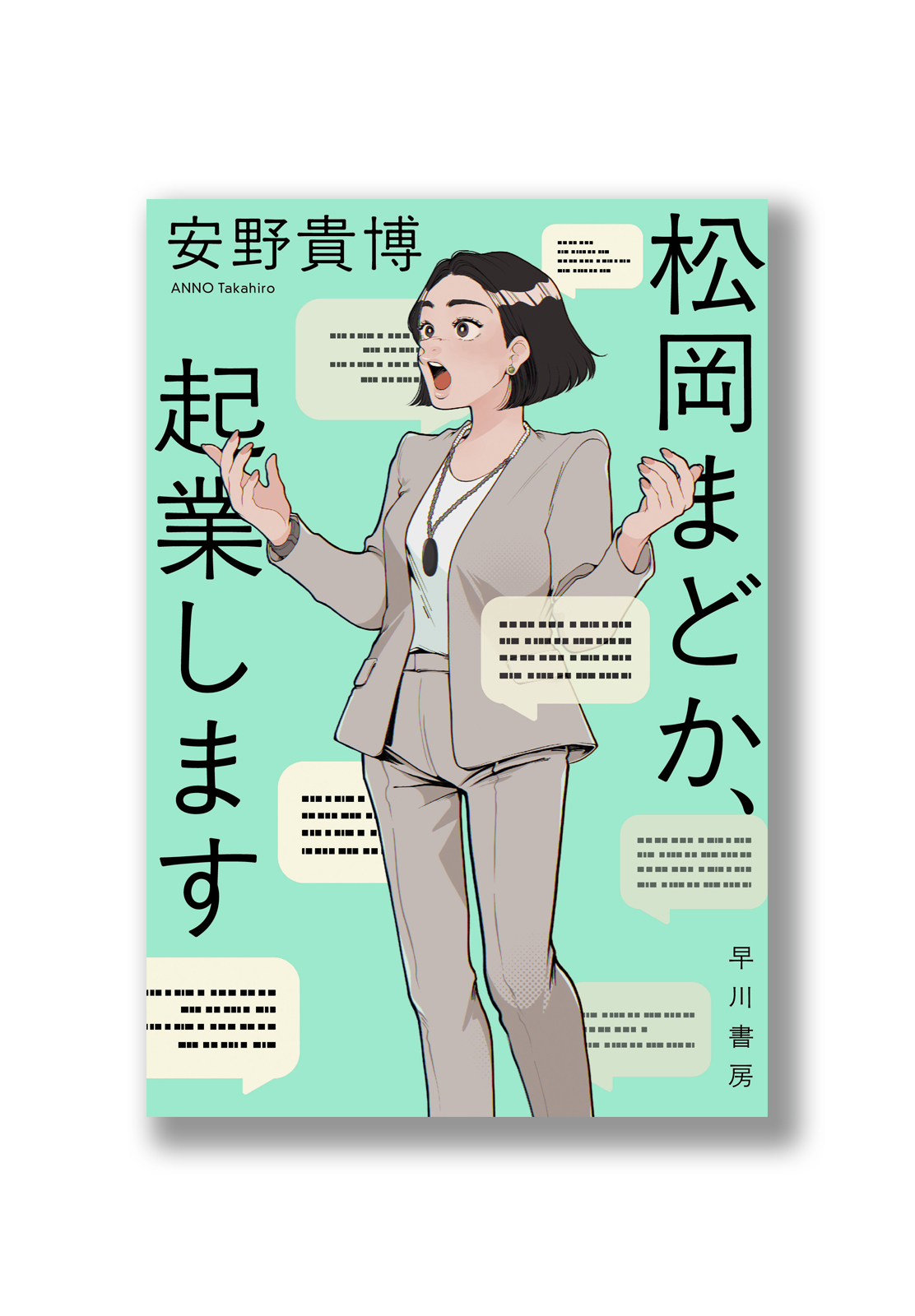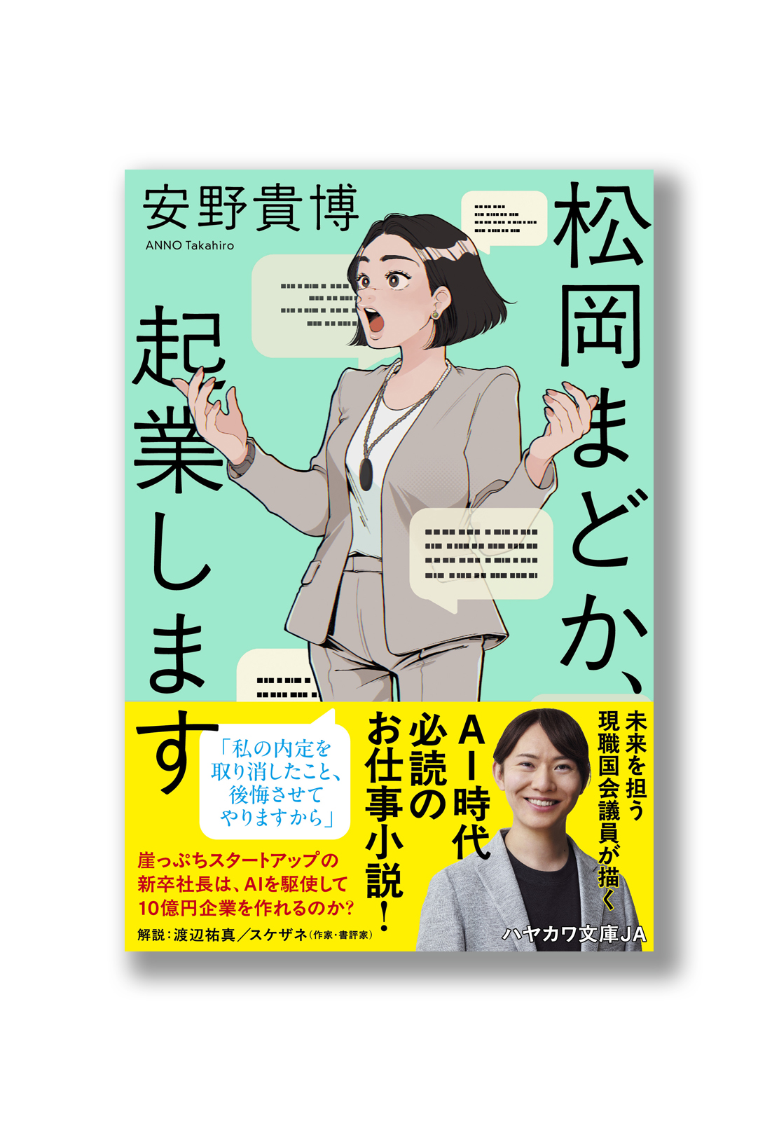 主人公のキャラを押し出したお仕事小説らしい装幀にしたい、というオーダー。特色を使用したパキッとした色味を背景に、起業家として熱弁をふるうまどかの姿を描いていただくことに。絵のアクセントとして、チャットボットを連想させる吹き出しをちりばめていただきました。