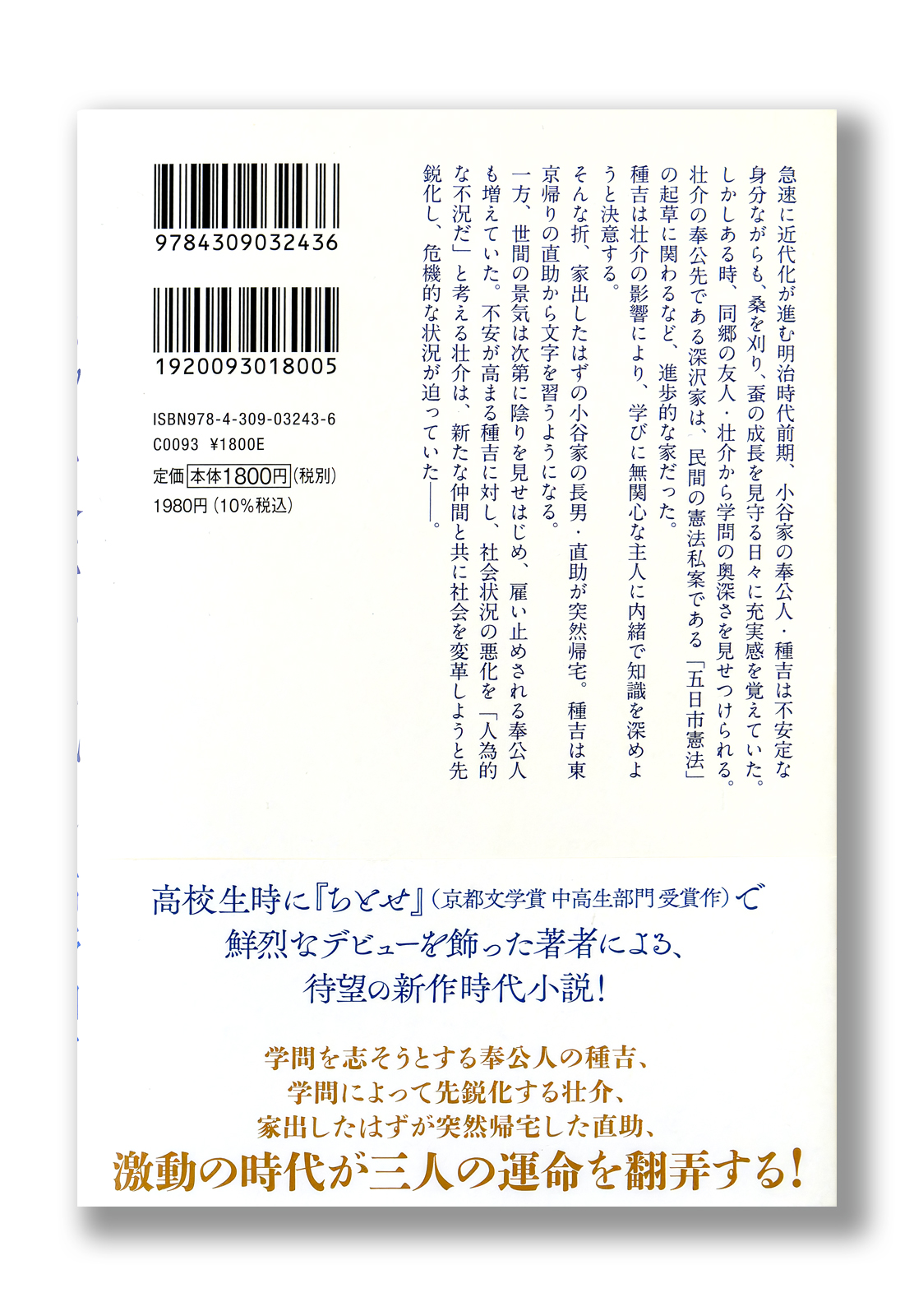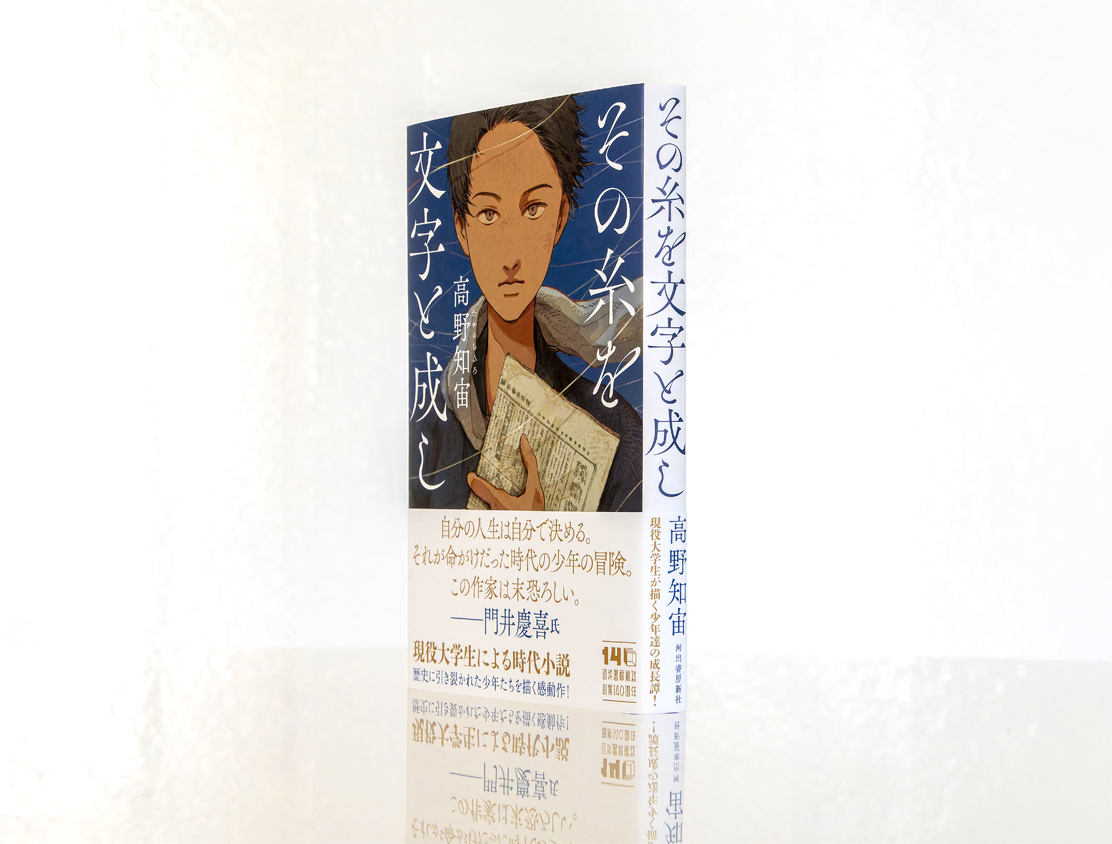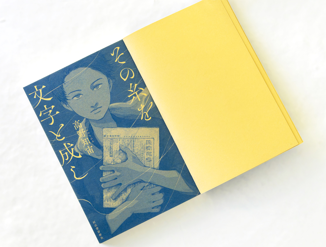 学問によって成長していく意志の強そうな少年の姿を描き出す装幀を目指し、たけもとあかるさんに装画をご依頼。たくさんアイディアをいただいた中から、新聞を大切そうに抱いた少年に糸が軽やかに絡む構図案が採用となりました。
