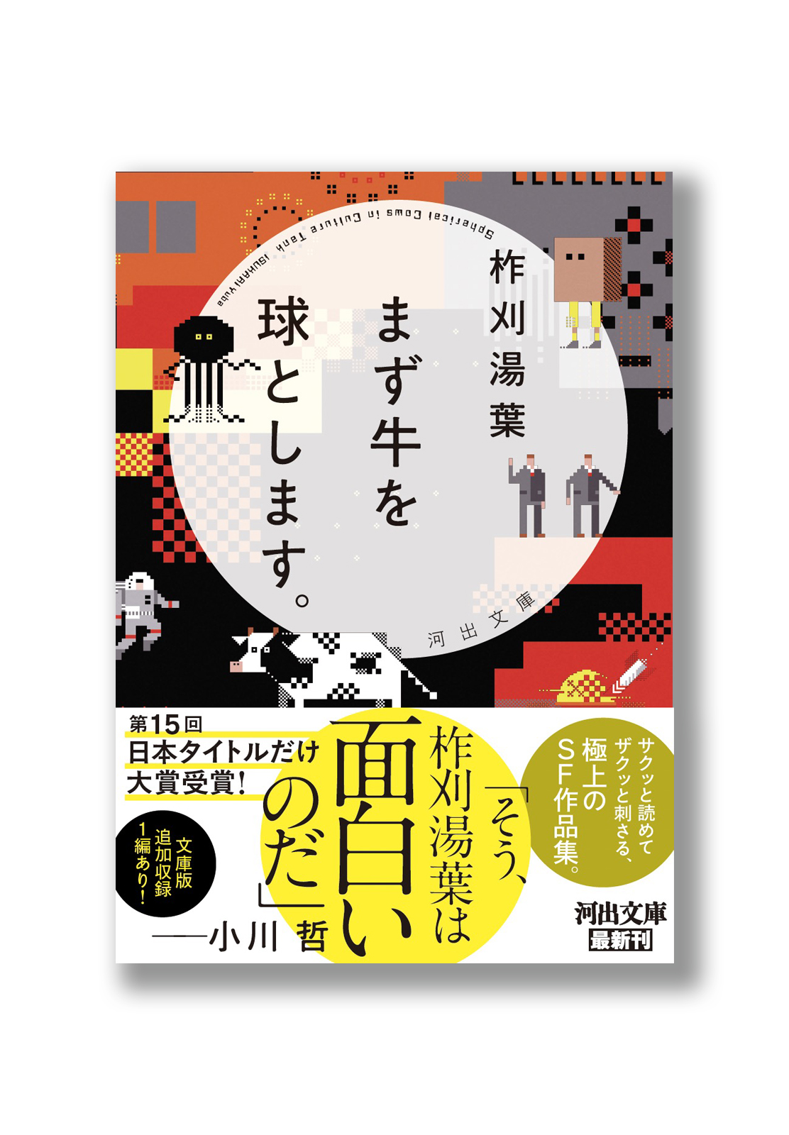 単行本に続いて装幀を担当。装画も同じものを使わせていただきましたが、単行本では表4にあった要素を表1に移動させるなど、文庫化にあわせてアップデートを図っています。各短編のモチーフを組み合わせ、それらが混ざり合うバグだらけの夢の中のような世界観の装画です。