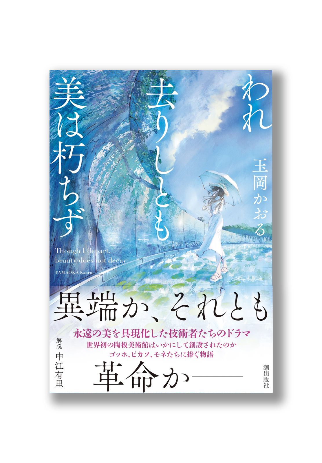 徳島県に実在する美術館をモデルとした作品。装画には、美術館を象徴するアート作品のひとつである屋外に設置されたモネの「大睡蓮」を、極端なパースがつくおもしろい画角で描いていただくことに。人物像を置くことでスケール感の把握、アートを鑑賞する自分の姿の投影が可能になることを目指しました。