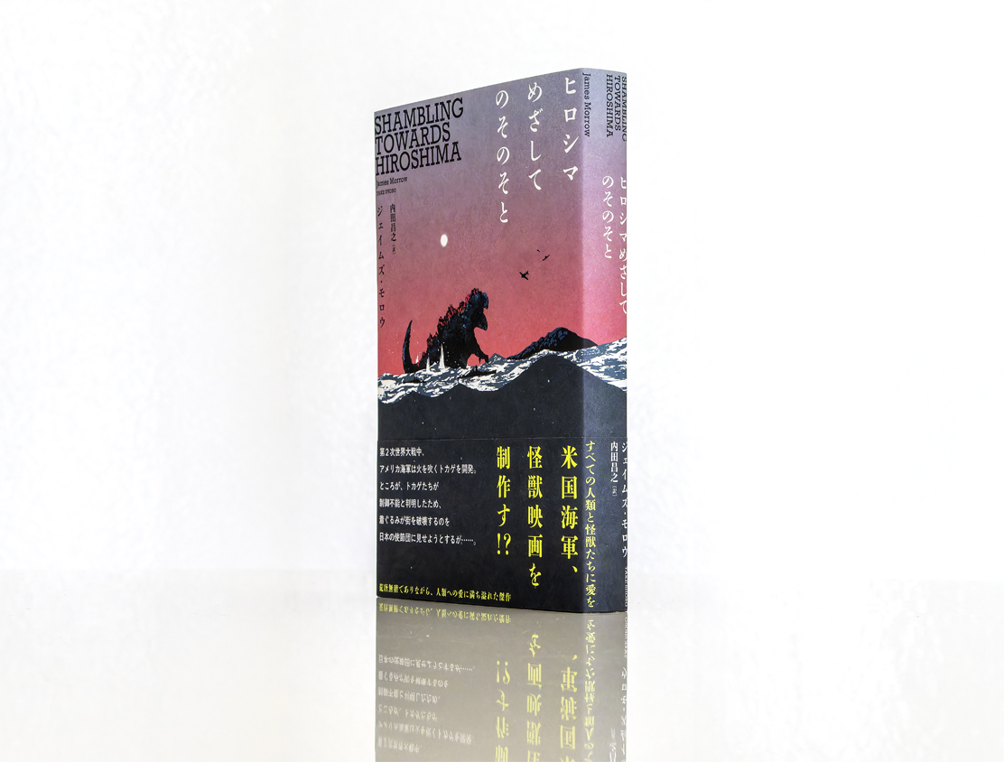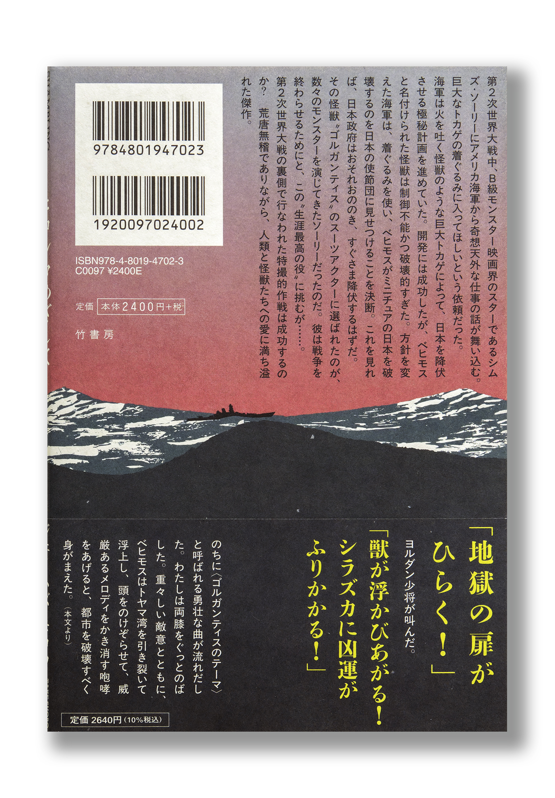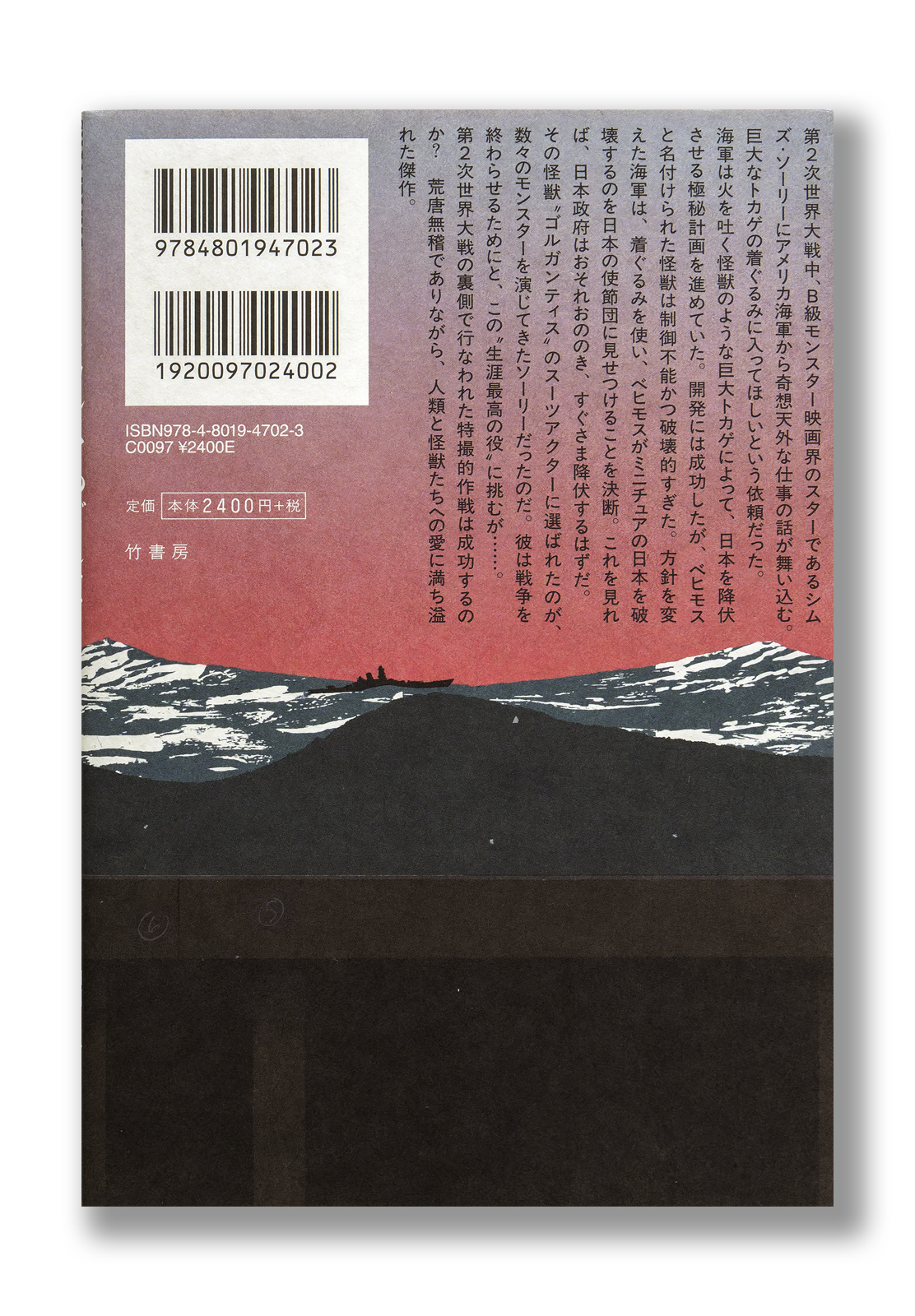 「着ぐるみの怪獣」であることを装画でどう表現すればいいか、見せ方を検討。結果、撮影中のワンシーンをセット込みで描いていただく、という案が採用に。セットの部分は帯で隠し、めくるとタネがわかる、というプランです。
