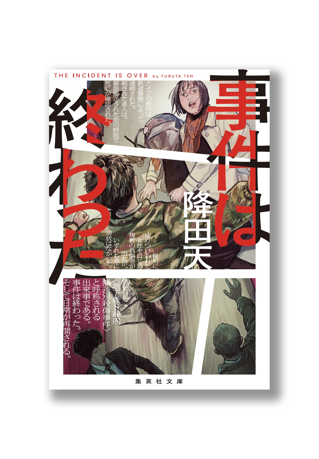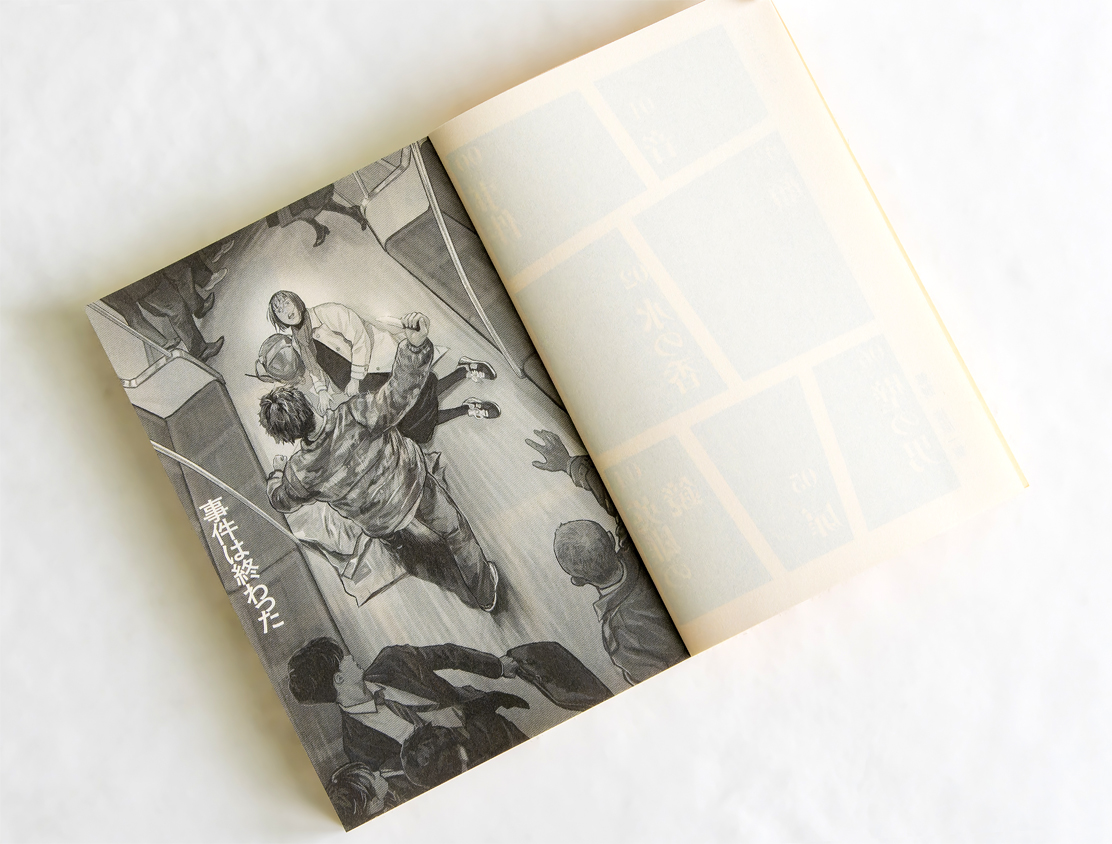 作中では終わった「事件」のその瞬間を装画にしたい、というオーダー。緊迫感と臨場感溢れる現場を描き出していただいたものを、装幀ではあえてコマ割りをし、本文の「事件」についての抜き出しと合わせて配置しました。さまざまな登場人物に焦点を当てる見せ方となっています。