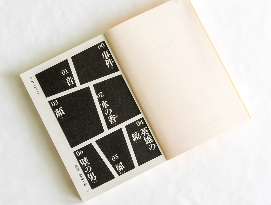 ショッキングな装画の全体像は、中扉でご覧いただけます。目次や章扉のデザインも担当しました。カバーのコマ割りのイメージを反映した、スタイリッシュなデザインに。
