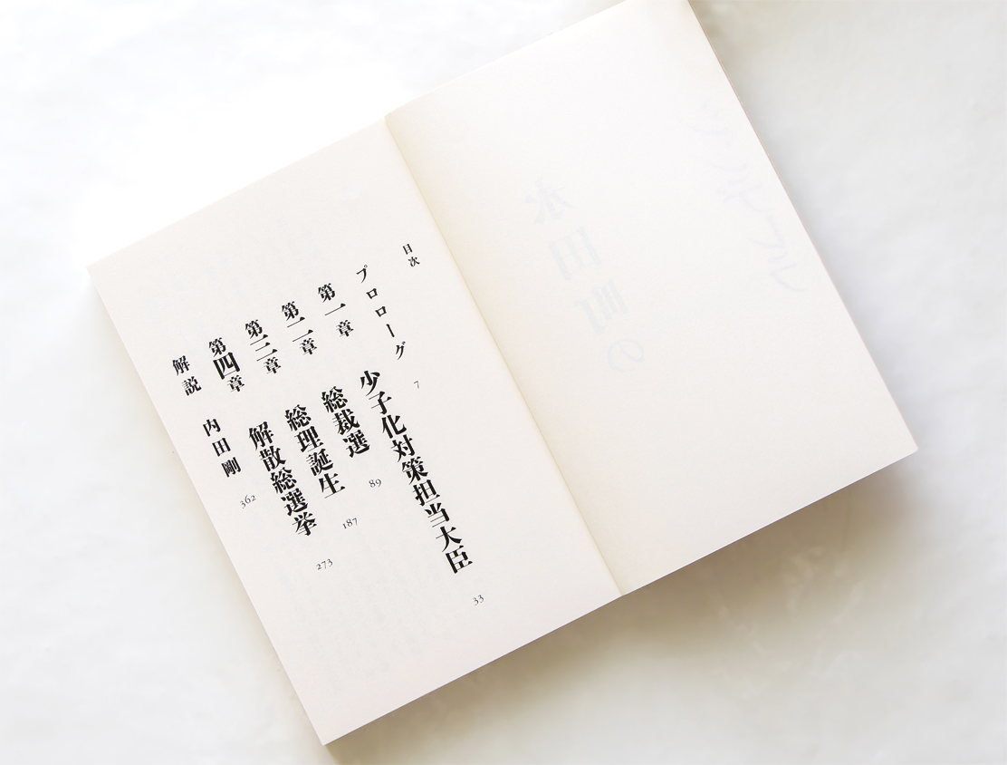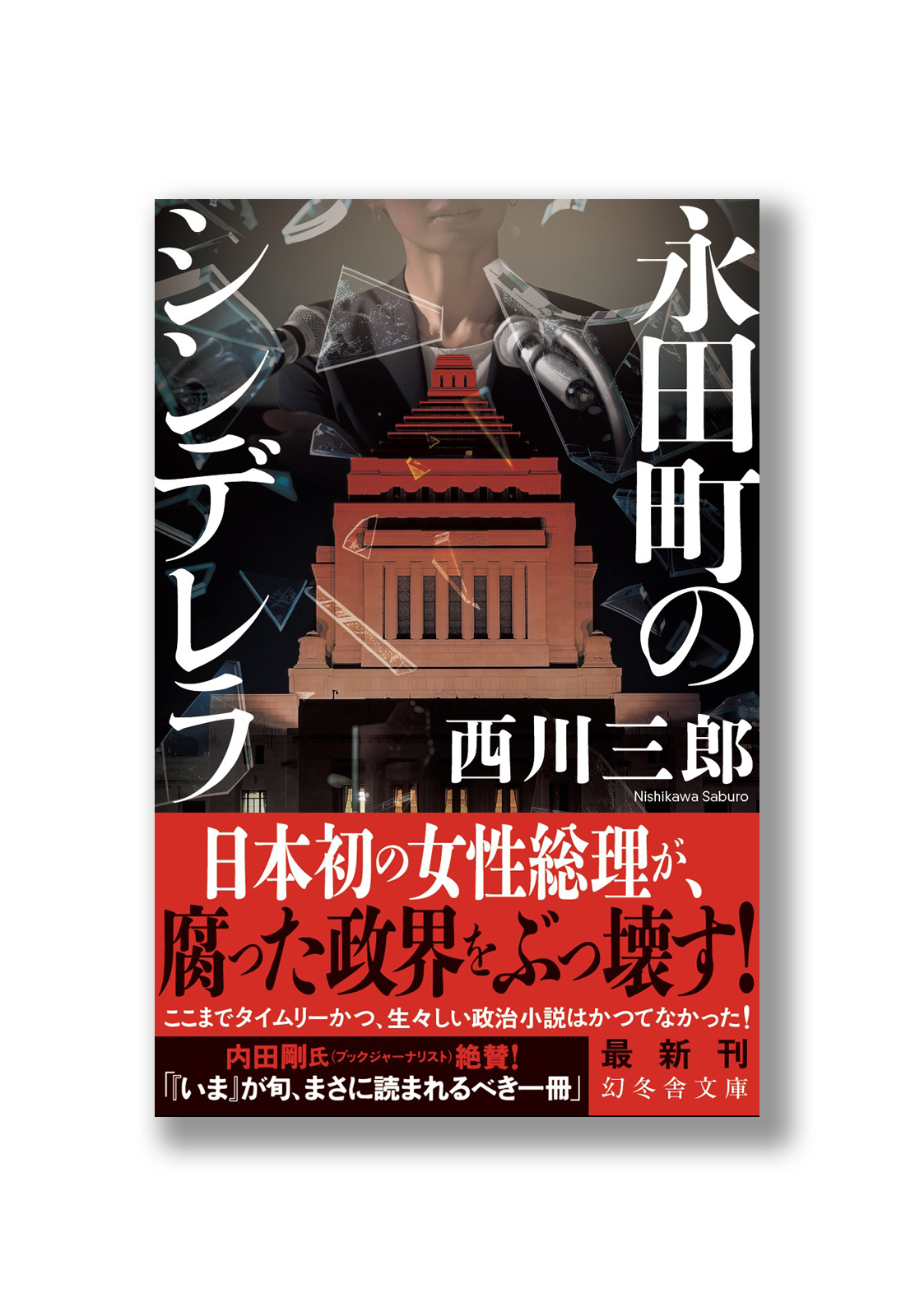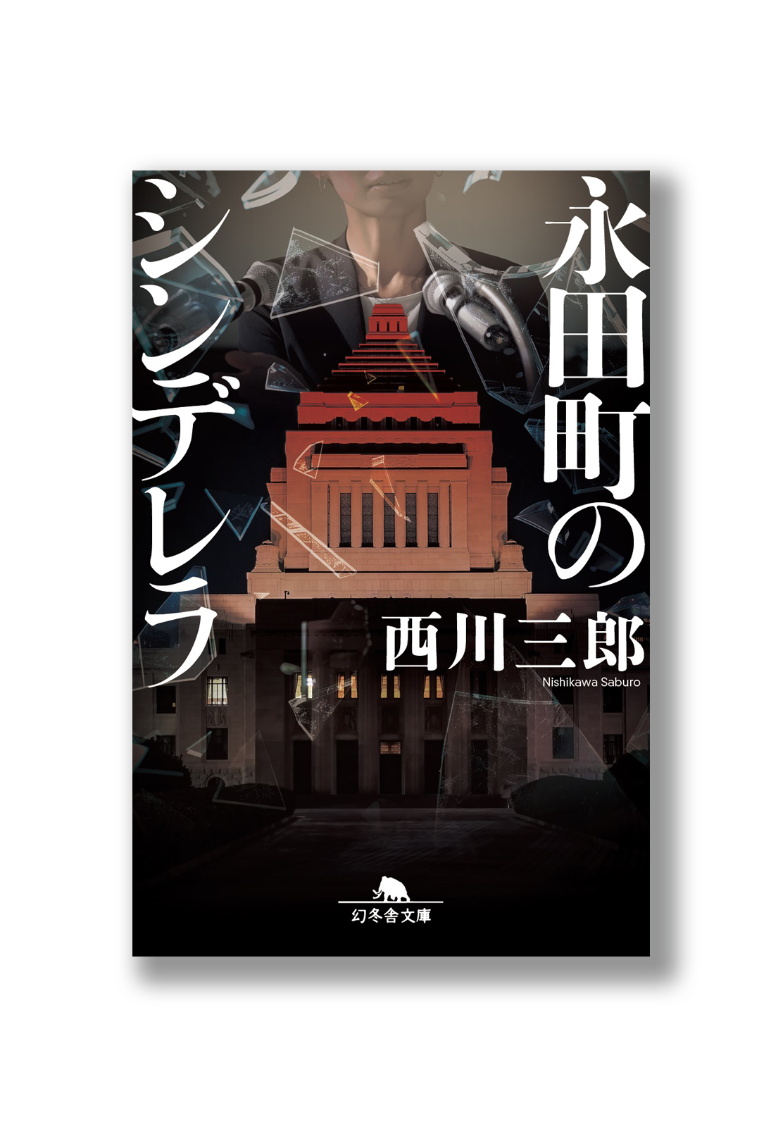 単行本に続いて装幀を担当。単行本よりダークなイメージで仕上げたいとのオーダーを受け、モチーフを検討。国会議事堂と女性総理らしいシルエットに、古い時代の崩壊をイメージさせるような飛び散るガラスの破片を重ねました。
